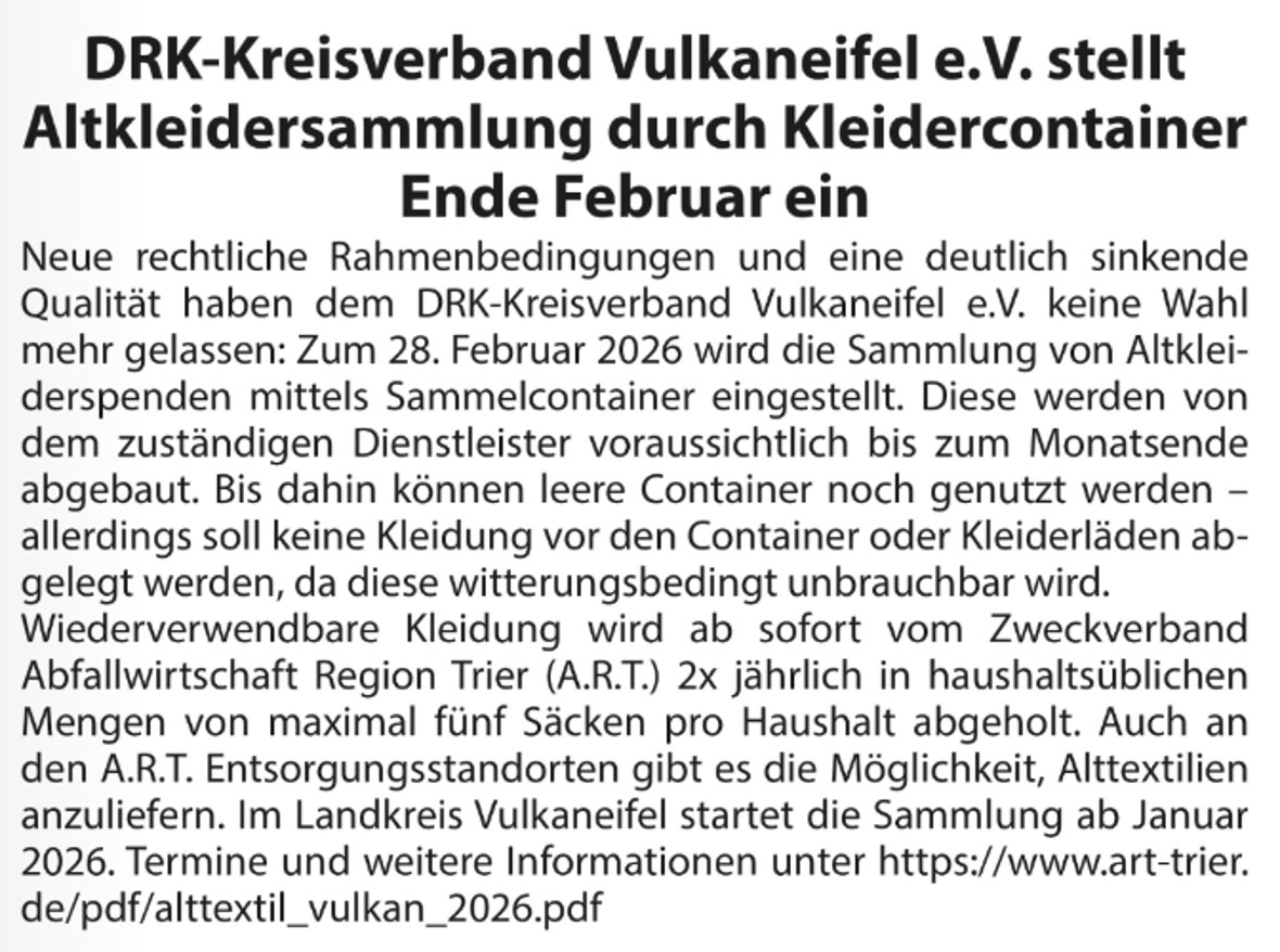 DRK-Kreisverband Vulkaneifel e.V. stellt Altkleidersammlung durch Kleidercontainer Ende Februar ein