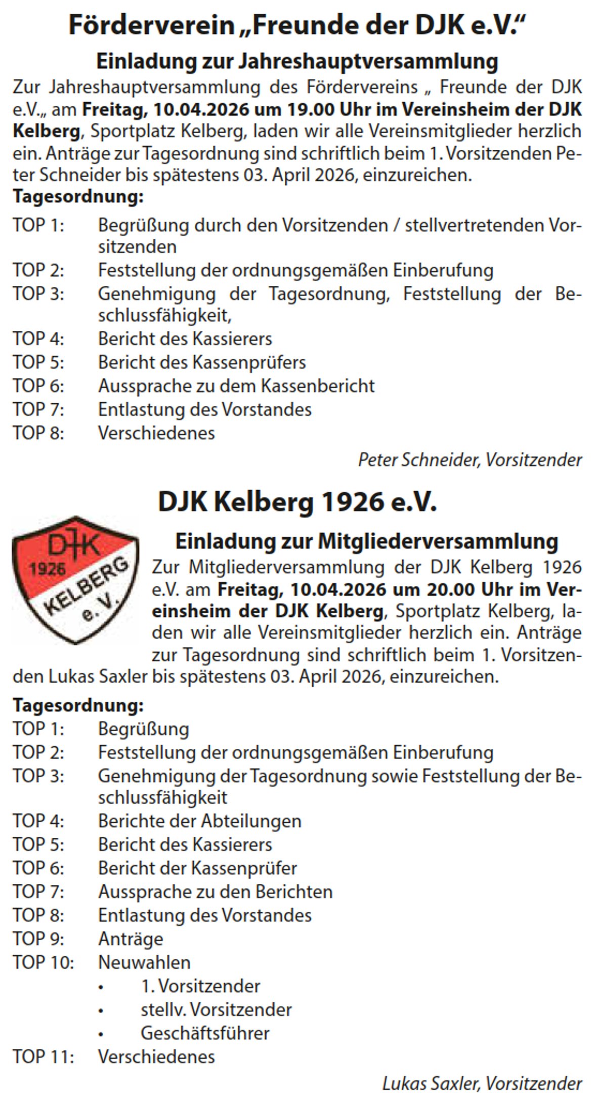 Förderverein "Freunde der DJK e.V." Jahreshauptversammlung und DJK Kelberg 1926 e.V. Mitgliederversammlung