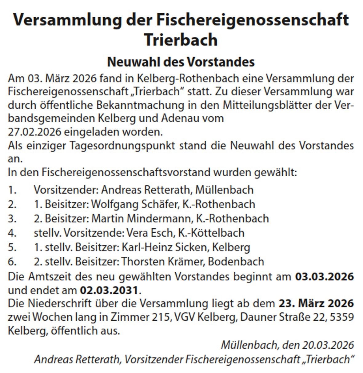 Versammlung der Fischereigenossenschaft Trierbach - Neuwahl des Vorstandes