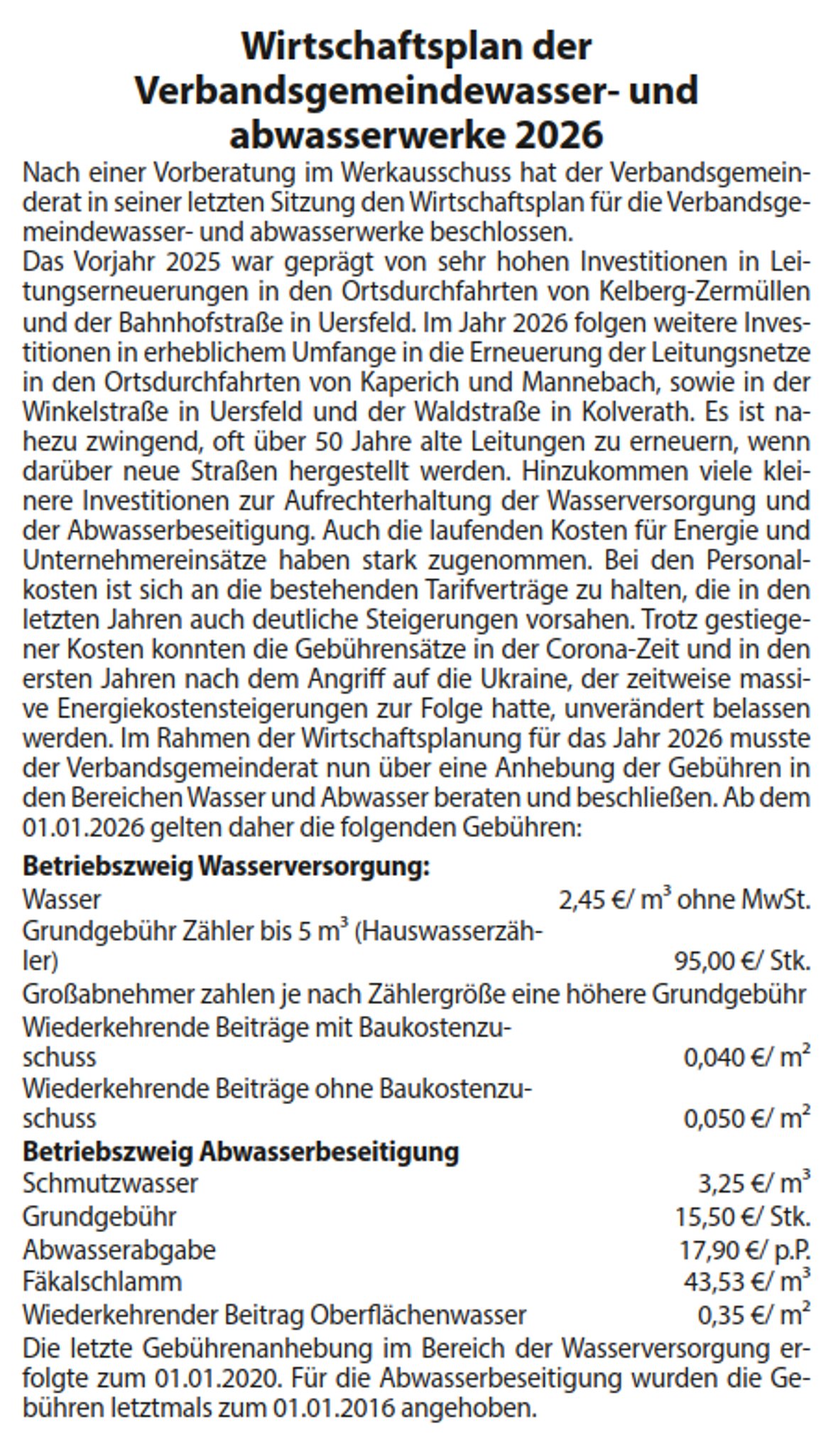 Wirtschaftsplan der Verbandsgemeindewasser- und abwasserwerke 2026