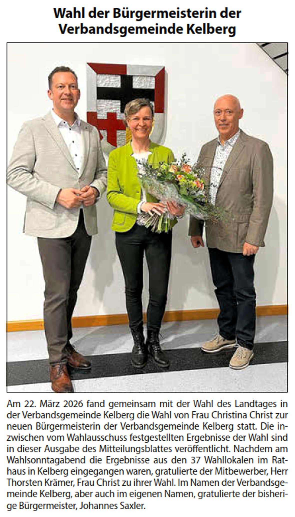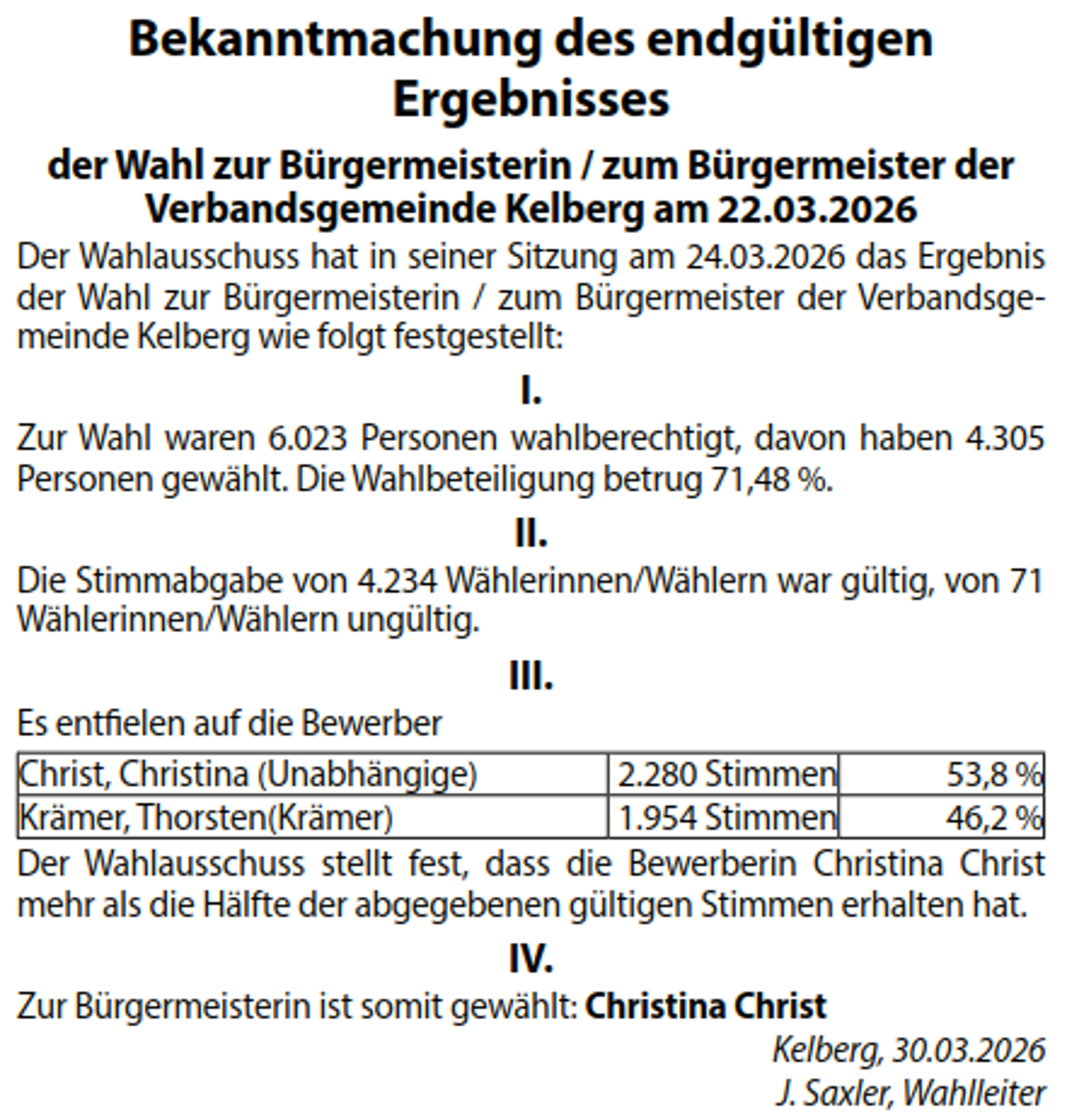 Wahl der Bürgermeisterin der Verbandsgemeinde Kelberg und Bekanntmachung des endgültigen Ergebnisses