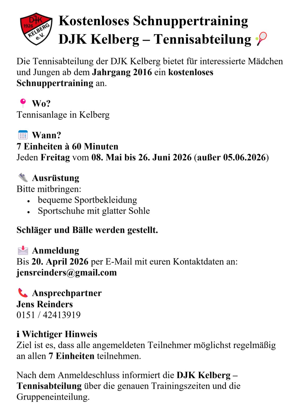 Kostenloses Schnuppertraining DJK Kelberg - Tennisabteilung