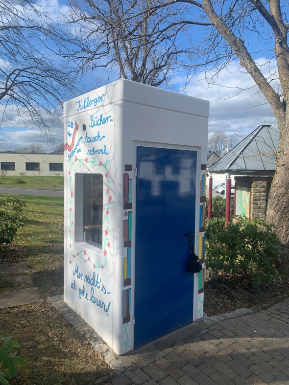 Auf Vorschlag der CDU- Fraktion beschloss der Rat mehrheitlich auf dem Marktplatz einen Bücherschrank aufzustellen. Bedenken im Hinblick auf die ehrenamtlich geleitete und gut angenommene Pfarrbücherei wurden vorgetragen, aber letztendlich also nicht so entscheidend bewertet. Der Vorschlag war gemacht und damit aber auch die weitere Bearbeitung abgegeben. Durch die guten Beziehungen zum Nürburgring konnten wir hier ein altes „Kassenhäuschen“ bekommen. Dieses „möbelte“ der Bauhof dann fachmännisch auf (Wasserstrahlen, verputzen, neue Tür und neues Fenster, Regale, etc.). Die Gestaltung der Außenflächen hat Frau Susanne Roth, Konrektorin an der Grund- und Realschule PLUS, mit Ihren jungen Künstlerinnen umgesetzt. Die Gestaltung ist wunderschön geworden. Die Farben sponserte Holger Schlich. Den Künstlerinnen, Frau Roth und Holger Schlich ein herzliches Dankeschön. Natürlich auch an das Bauhofteam für die bekannt gute Arbeit. Wer in dem neuen Schrank Bücher zur Verfügung stellen möchte, meldet sich bitte bei Ilse Zeimetz 02692 / 327 oder Albert Berens 02692 / 1637. Sie werden sich auch um die Unterhaltung, Pflege des Bücherschrankes und des Umfeldes kümmern. Die Bürgerinnen und Bürger, natürlich auch Gäste können, sich jetzt hier kostenlos Bücher ausleihen.