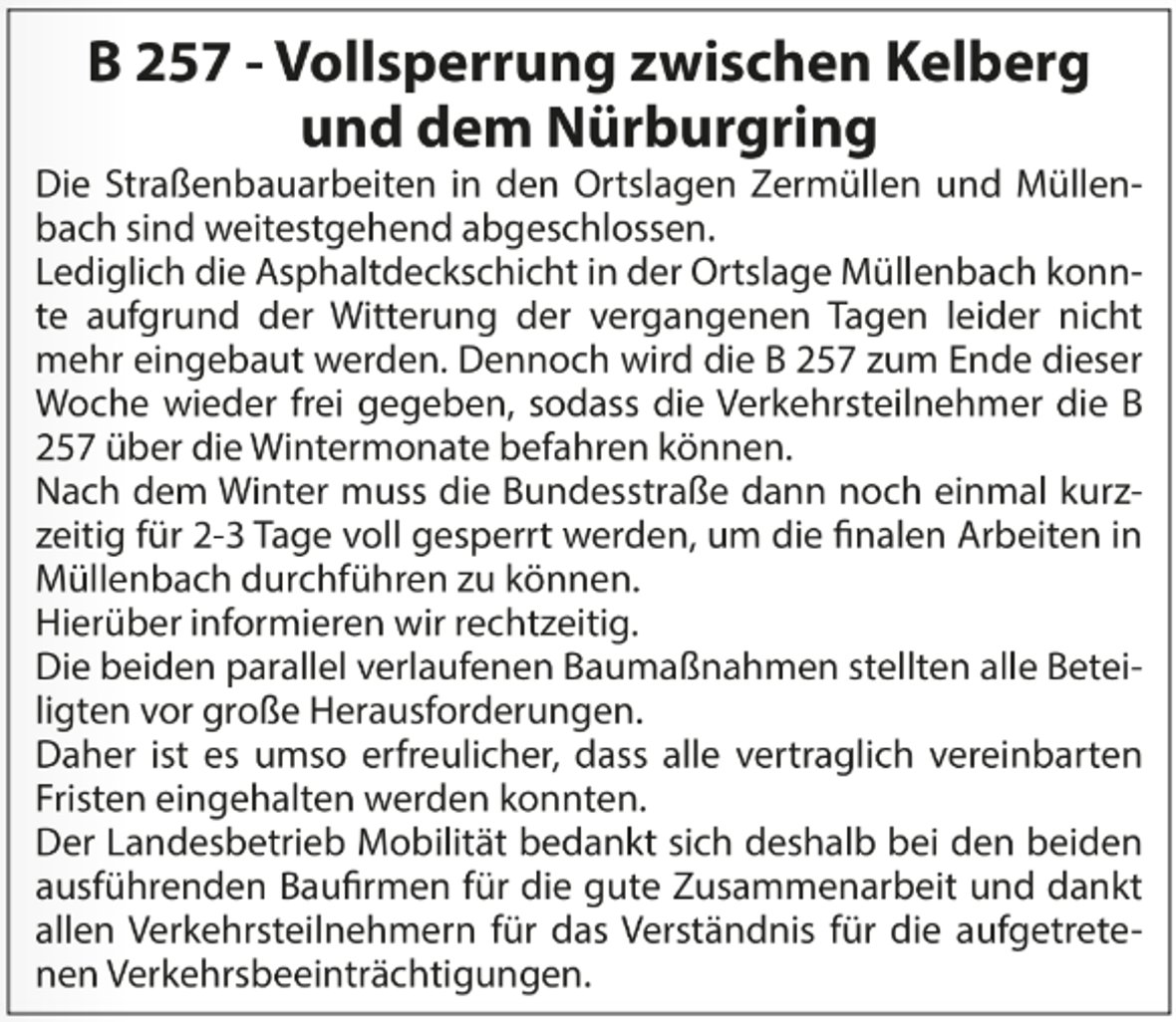 B257 - Vollsperrung zwischen Kelberg und dem Nürburgring