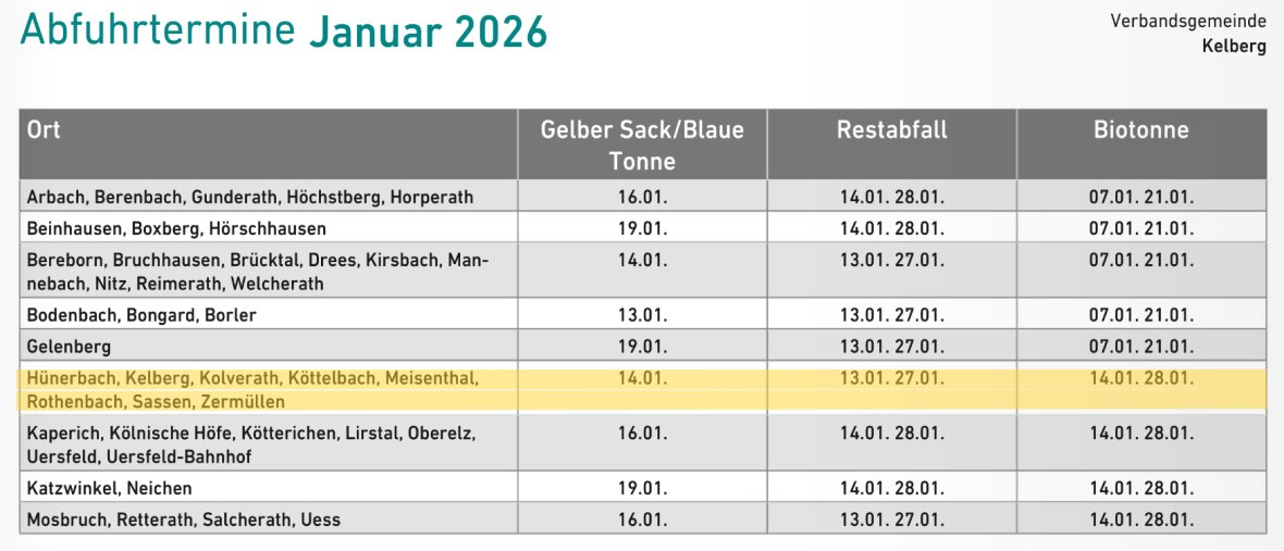 Der hier bereitgestellte Abfuhrkalender für Kelberg und die Ortsteile kann heruntergeladen und für die Pinnwand ausgedruckt werden.