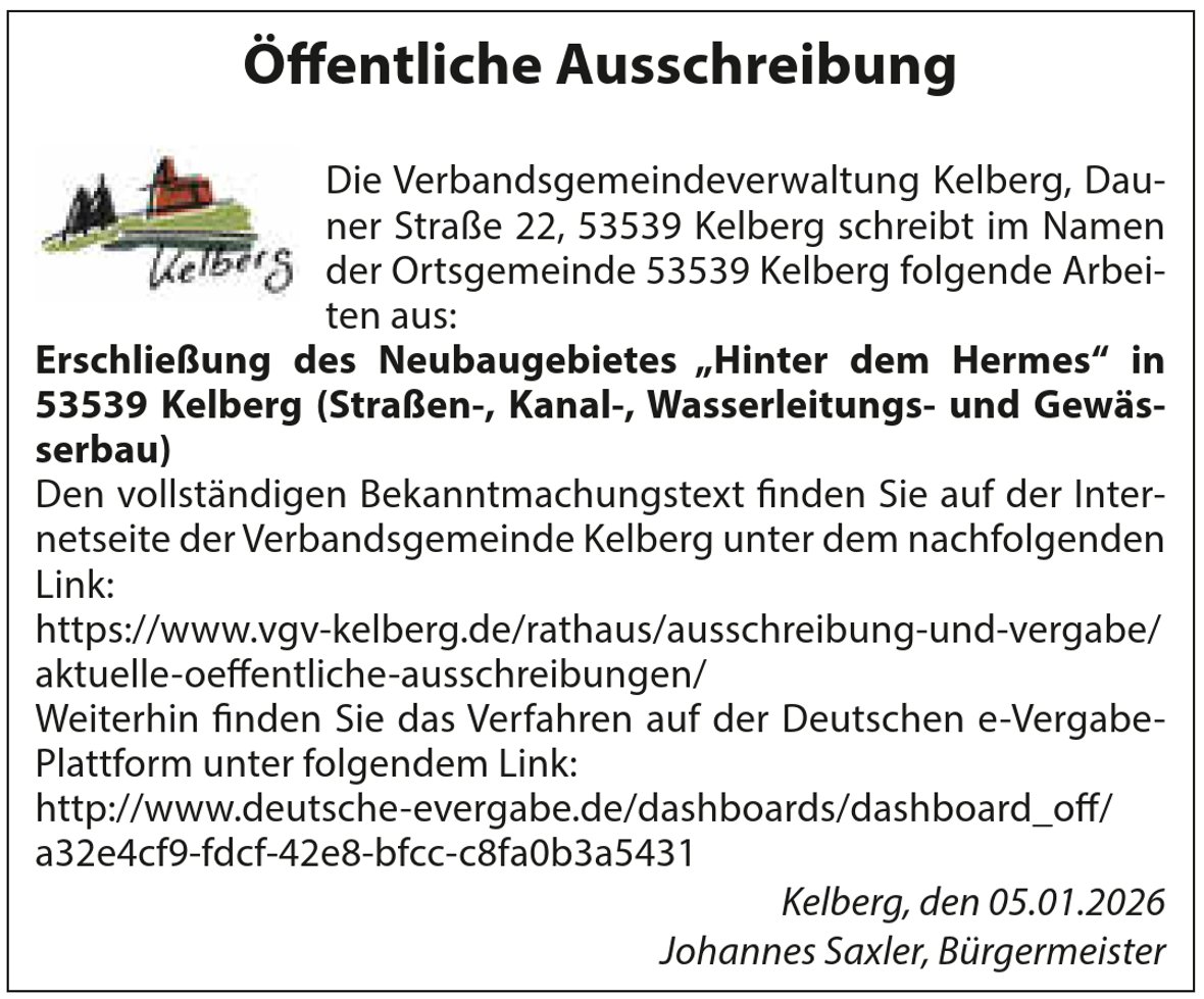 Öffentliche Ausschreibung - Erschließung des Neubaugebietes "Hinter dem Hermes" in Kelberg